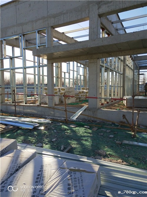 安装方法:根据龙骨布置图纸竖向主龙骨([14槽钢背靠背)的间距1202mm,天地龙骨及水平龙骨单根槽钢间距大约1200mm,竖向及横向龙骨平交,横向龙骨槽钢上下翼缘切割后与竖向槽钢插接焊接(见节点详图)竖向龙骨顶端与原结构檩条下端齐平。